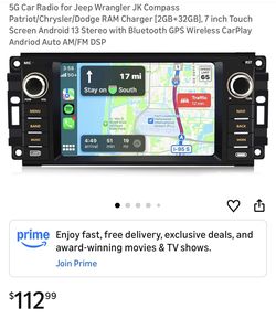 5G Car Radio for Jeep Wrangler JK Compass Patriot/Chrysler/Dodge RAM Charger [2GB+32GB], 7 inch Touch Screen Android 13 Stereo with Bluetooth GPS Wire$60Ontario, CA