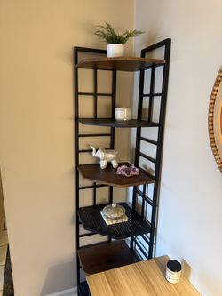 Tall 77” dark wood and metal corner shelf$80Willow Springs, IL