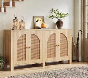 New assembled Sideboard Buffet Cabinet, 59" Rattan Credenza Kitchen Storage Buffet Cabinet with 4 Doors, Long Farmhouse Coffee Bar Station Table for D$165Norwalk, CA