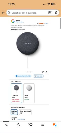 Google Nest Mini 2nd Generation Smart Speaker with Google Assistant- Charcoal$30Renton, WA