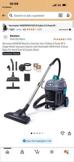 Kenmore KW3050 Wet Dry Canister Vac 4 Gallon 5 Peak HP 2-Stage Motor Vacuum Cleaner with Washable HEPA Filter & Dust Bags for Hard Floor & Carpet, Bla$50Huntington Beach, CA