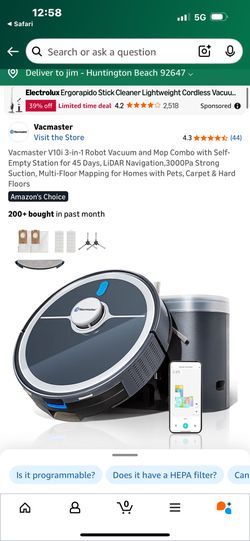 Vacmaster V10i 3-in-1 Robot Vacuum and Mop Combo with Self-Empty Station for 45 Days, LiDAR Navigation,3000Pa Strong Suction, Multi-Floor Mapping for $90Huntington Beach, CA