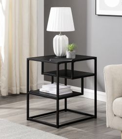Walker Edison Contemporary Wood and Metal Tiered Side Table, featuring a black powder-coated steel frame and warp-resistant MDF wood shelving. ®$40Los Angeles, CA