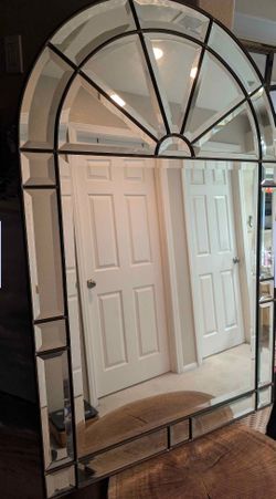 Arched window-pane mirror with beveled glass. Very heavy, high-quality construction. Dark metal/wood frame. No damage.