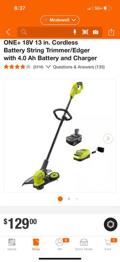 RYOBI ONE+ 18V 13 in. Cordless Battery String Trimmer/Edger with 4.0 Ah Battery and Charger$80Phoenix, AZ