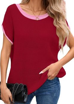 (M)Womens Oversized Lightweight Cute Striped Sweater Crewneck Hollow Out Cap Sleeve Knit Top