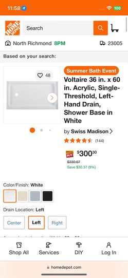 Swiss MadisonVoltaire 36 in. x 60 in. Acrylic, Single-Threshold, Left-Hand Drain, Shower Base in White$80King George, VA