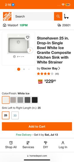Stonehaven 25 in. Drop-In Single Bowl White Ice Granite Composite Kitchen Sink$20King George, VA