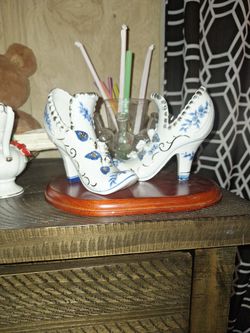 Vintage porcelain shoes, 5” high, embellished with blue, white & gold accents$65Greenville, SC