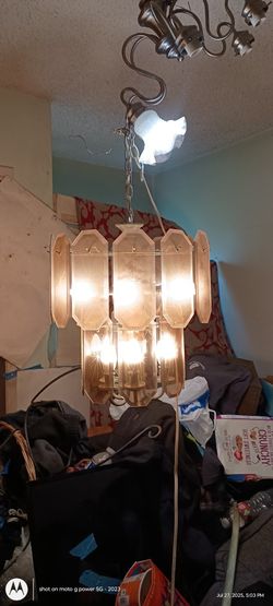 $70 VINTAGE LATE 1960s 2 TIER CHANDELIER, HANGING LAMP, UNDERWRITERS LABORATORIES. 2 TIER SMOKED BEVELLED GLASS 9 LIGHT CHANDELIER SOLD FOR $995!$70Monrovia, CA
