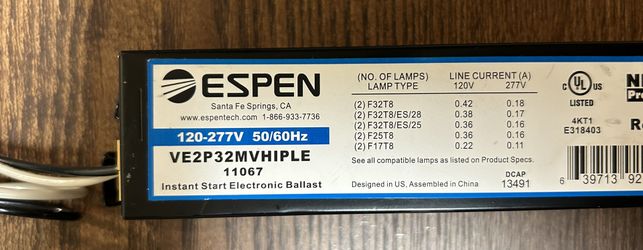 ESPEN VE2P32MVHIPLE Instant Start Electronic Ballast 2 Lamp 120-277V$60Richmond, CA