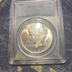 PCGSMS 63 1922 silver dollar has toning on both sides. Very nice piece.$200Port Chester, NY