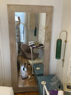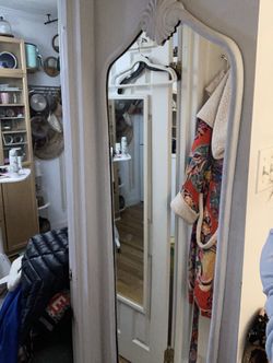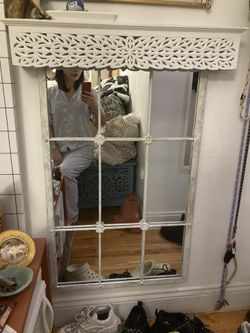 Distressed White Window Pane Wall Mirror with Carved Top$40New York, NY
