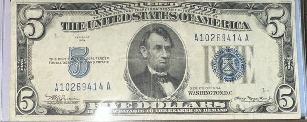 1934 $5 Bill Silver Certificate Good Condition Blue Seal Certified $50Framingham, MA