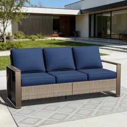 75" Patio Metal Wicker Sofa, All Weather Outdoor Rattan 3-Seat Sofa Couch with Premium Cushions & Rectangular Framed Wood-Looking Metal Armrest for Ga$220Ontario, CA
