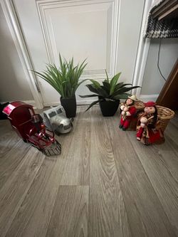 Decorative Lot of 6 – Metal Train & Truck, 2 Faux Plants, 2 Folk Art Dolls$100Katy, TX