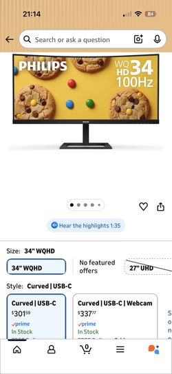 Philips 346E2CUAE 34'' Curved Frameless UltraWide QHD 3440x1440,100Hz 1ms MPRT, sRGB 121%, USB-C Charging, MultiView PIP/PBP, Height Adjustable, 4Yr A$250Bellevue, WA