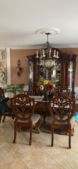 Beautiful dinning room set solid wood table with pedi stool. China hutch light 2 extra leafs$1,800Holbrook, NY