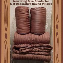 KING SIZE COMFORTER & 2 DECORATIVE ROUND PILLOWS (NEVER USED)