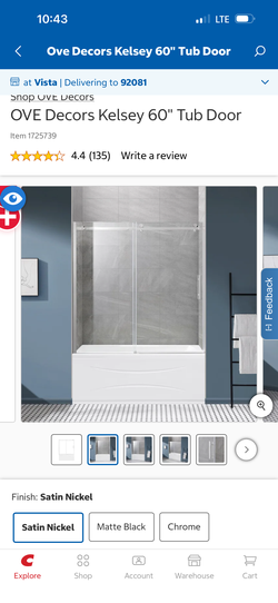 Brand New OVE 60” Bathtub Glass Door – Retail $400+$299Claremont, CA