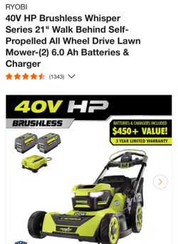 New RYOBI 40V HP Brushless Whisper Series 21" Walk Behind Self-Propelled All Wheel Drive Lawn Mower-(2) 6.0 Ah Batteries & Charger$350Bakersfield, CA