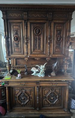 9 FEET TALL, MADE CUSTOM FOR OUR GREAT GREAT GRANMOTHER, Beautiful Very Nice Old Wooden China Cabinet With Puppet Carvings, Cabinet Locks With Keys$22,000Long Beach, CA