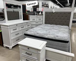 Kanwyn Whitewash Upholstered Panel Bedroom Set Bed, Dresser, Mirror, Nightstand, Chest $2,600Dallas, TX