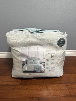 12pc Queen Vesta Comforter Bedding Set Light Aqua Blue- 1 Comforter, 1 Throw, 2 Standard Shams, 2 Euro Shams, 2 Decorative Pillows, 2 Pillow Cases, 1 $80Los Angeles, CA