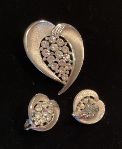 Crown Trifari Heart Brooch, Aurora Borealis Rhinestones, Clip Earrings 1960’s RARE$120Ind Crk Vlg, FL