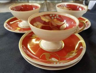 Vintage Oscar Schlegelmilch Handgemalt demitasse 7 pc. set cream and rust colored with raised gold leaf pattern includes 3 demitasse/espresso cups, 4 $16Hesperia, CA