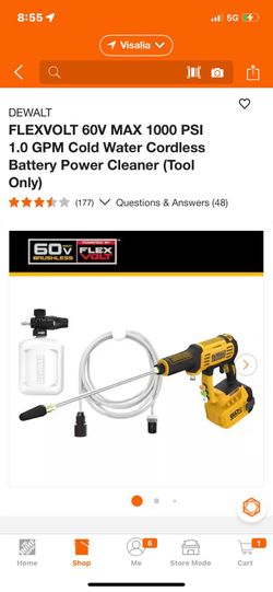 FLEXVOLT 60V MAX 1000 PSI 1.0 GPM Cold Water Cordless Battery Power Cleaner Kit w/(1) FLEXVOLT 3 Ah Battery and Charger$180Farmersville, CA