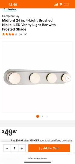 Hampton Bay Midford 24 in. 4-Light Brushed Nickel LED Vanity Light Bar with Frosted Shade$20La Verne, CA