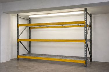 Selling (2) 12-ft tall commercial warehouse pallet rack sections. Heavy-duty industrial steel uprights with yellow beams and wire decking. Extremely $900Anaheim, CA
