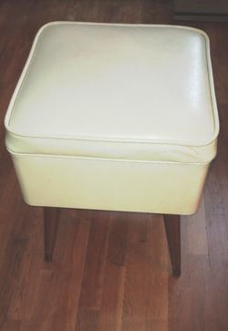 Vintage Sewing Hassock Stool Mid Century Modern Off White Blonde Wooden Legs