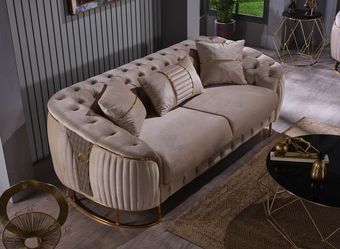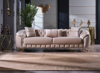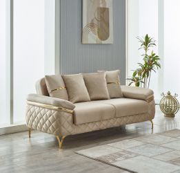 Elegant Beige Velvet Sofa with Gold Accents and Tufted Design – Luxurious Modern Seating$799Saddle Brook, NJ