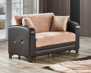 Modern Two-Tone Loveseat with Faux Leather and Wood Accents – Convertible Sofa with Hidden Storage and Plush Cushioning$349Saddle Brook, NJ