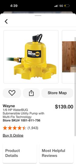 Wayne 1/6 HP WaterBUG Submersible Utility Pump with Multi-Flo Technology$65Phoenix, AZ
