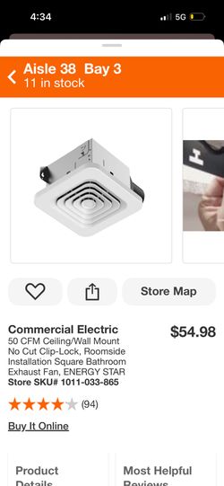 Commercial Electric 50 CFM Ceiling/Wall Mount No Cut Clip-Lock, Roomside Installation Square Bathroom Exhaust Fan, ENERGY STAR$30Phoenix, AZ