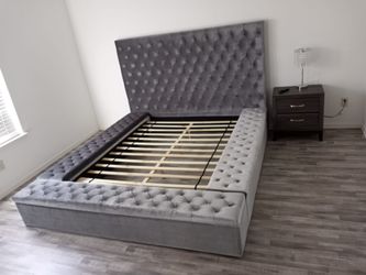 Gently used queen size bedframe with storage grey color$499Houston, TX