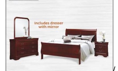 Queen size cherry color, bed, frame, dresser, mirror, and nightstand on sale$599Houston, TX