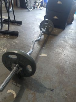 Bench press bar with two 10lb plates and clips$15Portland, OR