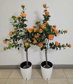 PAIR of 5ft Faux Orange Camellia Trees in 16" White Resin Planters (2 for $110) @ Lasting Creations$110Oakland Park, FL