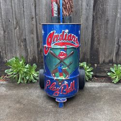 Vintage Indians Oil Barrel Baseball Bat And Leather Glove Cart Homemade Hand painted Air Brush Handmade Softball$100Modesto, CA