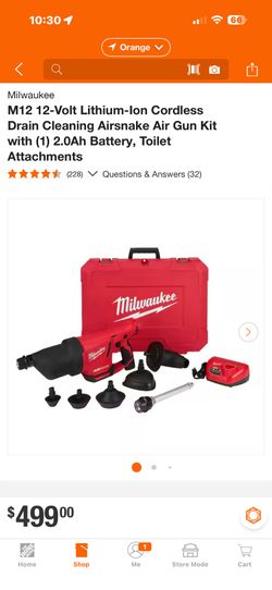 Milwaukee M12 12-Volt Lithium-Ion Cordless Drain Cleaning Airsnake Air Gun Kit with (1) 2.0Ah Battery, Toilet Attachments$350$350Orange, CA