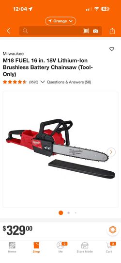 Milwaukee M18 FUEL 16 in. 18V Lithium-lon Brushless Battery Chainsaw (Tool-Only)$260Orange, CA