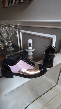 Chanel CC Logo Oxfords Lace-up Pink Bronze Black Patent Leather Shoes Size 39 US 8$450Framingham, MA