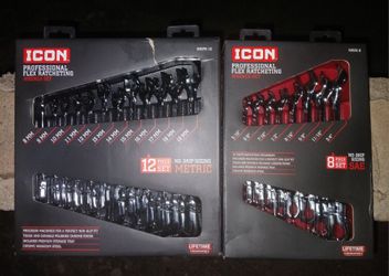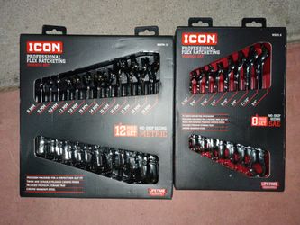 ICON Professional Flex Head Ratcheting Wrench Sets New In Box. 12 Piece Metric And 8 Piece Sae Retail For Both Is $340. Only $180$180Chandler, AZ