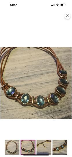 ST Thomas Leather Corded Necklace Blue Crystal Cabochons Gold Tone VTG Has Tag$22Oceanside, CA