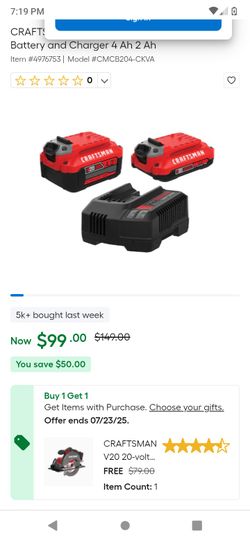 Craftsman 20v 4.0ah And 2.0ah 2 battery And Charger Kit$60Madera, CA