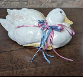 cream-colored duck figurine, 13 in, decorated with pink and blue ribbons$10Philadelphia, PA
